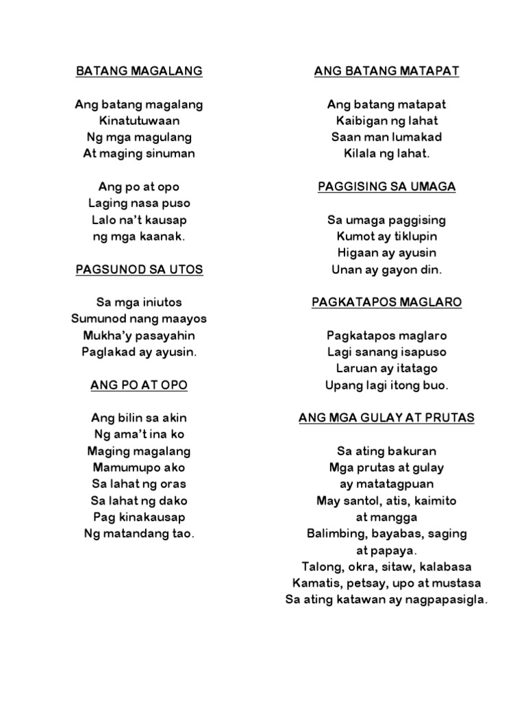 Tula na ang batang magalang. Ginawan q ng assignment c laipot hohoh patama to skanya. Di nakikipag-away sa kapwa bata At di gumagamit salitang masagwa. With 266 reads.